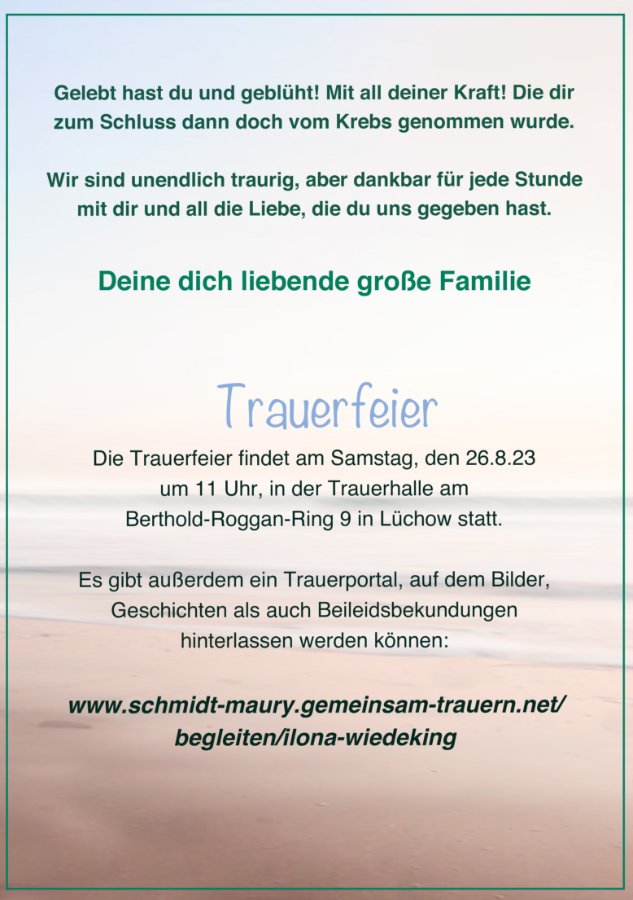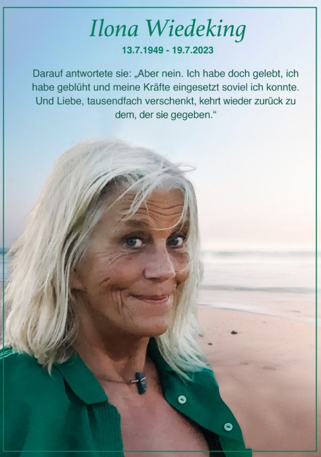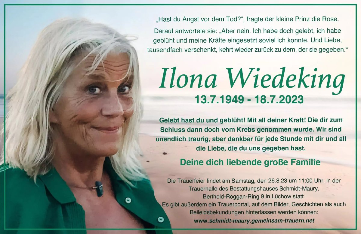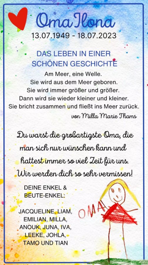 Ihr Lieben, Ihr habt Ilona, die Königin eurer Familie verloren, dazu gibt es keine richtigen Worte zu sagen.